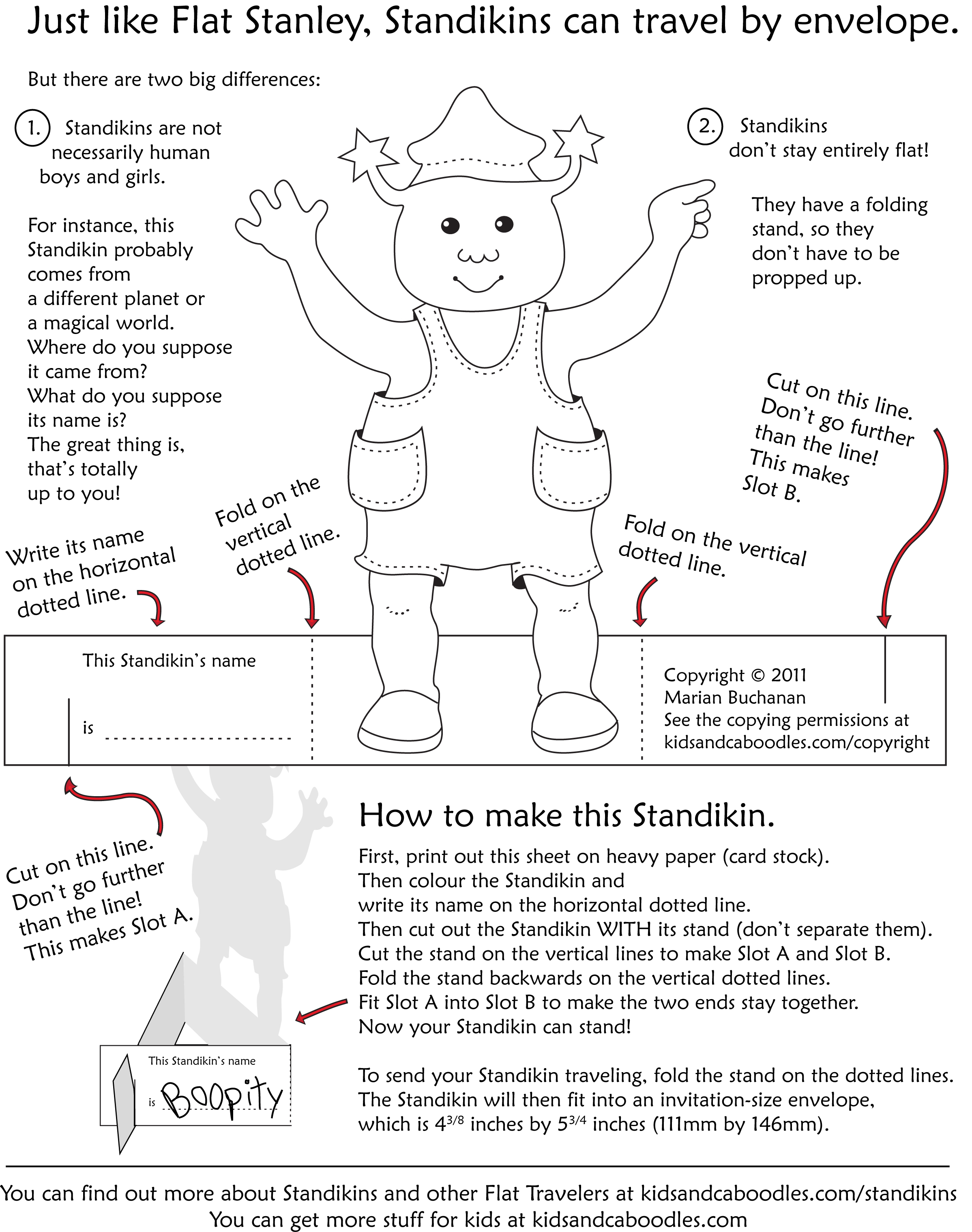 The thing is, though, that Flat Stanleys and Flat Travelers really are totally flat. They need to be propped up when they have their picture taken in the real world. I thought it would be a good idea to make “flat” travellers who could stand on their own. So I went ahead and created a new kind of Traveller, with a stand. I call them Standikins.